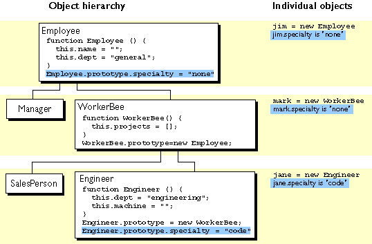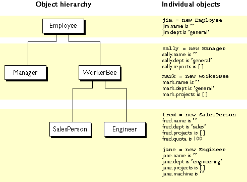 and WorkerBee definitions show the difference in how to specify the next object higher in the inheritance chain. In JavaScript, you add a prototypical instance as the value of the prototype