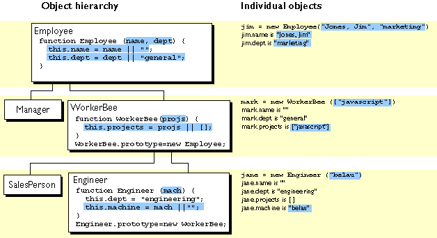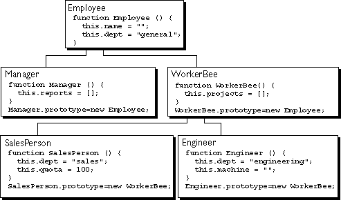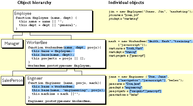and WorkerBee definitions show the difference in how to specify the next object higher in the inheritance chain. In JavaScript, you add a prototypical instance as the value of the prototype